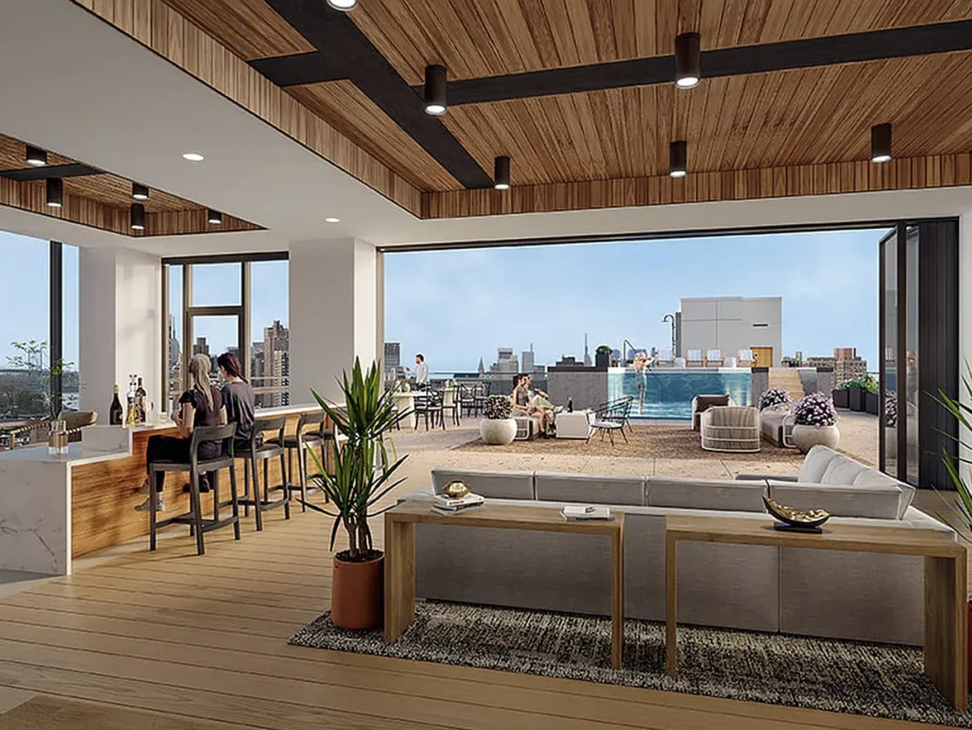 1998 has exceptional 5 star amenities, including a 2,000-square-foot lounge with floor-to-ceiling windows with a bar, fireplace and large screen television on the 12th floor, opening through folding glass doors to a 3500 sq. ft. roof deck with stunning views of the east river and surrounding neighborhood, as well as a swimming pool, 17-foot LED TV, and BBQ areas with table seating. Also featured is a state-of-the art fitness center and an intimate separate media screening room. 1998 has a 24-hour attended lobby and is a pet-friendly building.