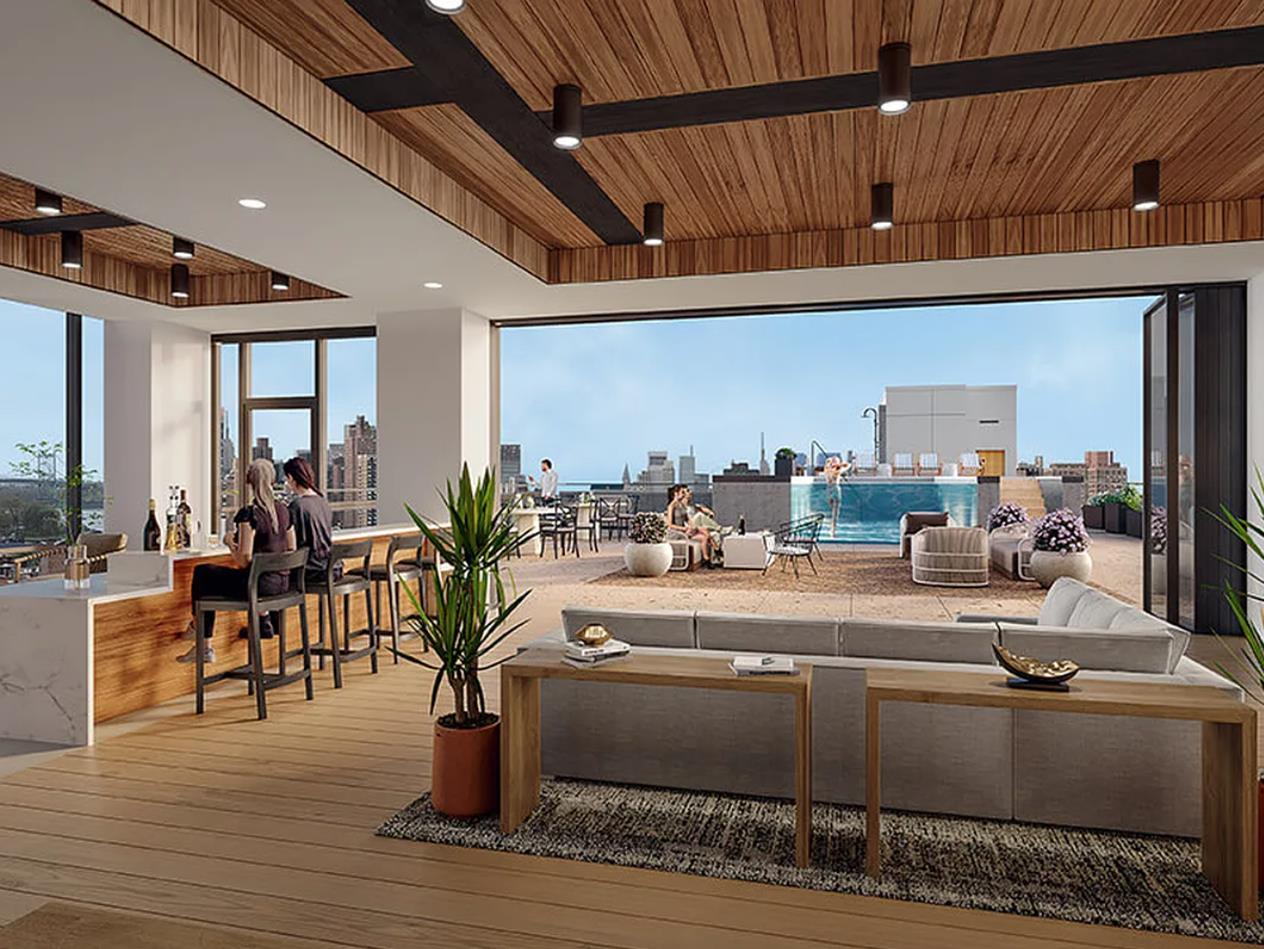 1998 has exceptional 5 star amenities, including a 2,000-square-foot lounge with floor-to-ceiling windows with a bar, fireplace and large screen television on the 12th floor, opening through folding glass doors to a 3500 sq. ft. roof deck with stunning views of the east river and surrounding neighborhood, as well as a swimming pool, 17-foot LED TV, and BBQ areas with table seating. Also featured is a state-of-the art fitness center and an intimate separate media screening room. 1998 has a 24-hour attended lobby and is a pet-friendly building.