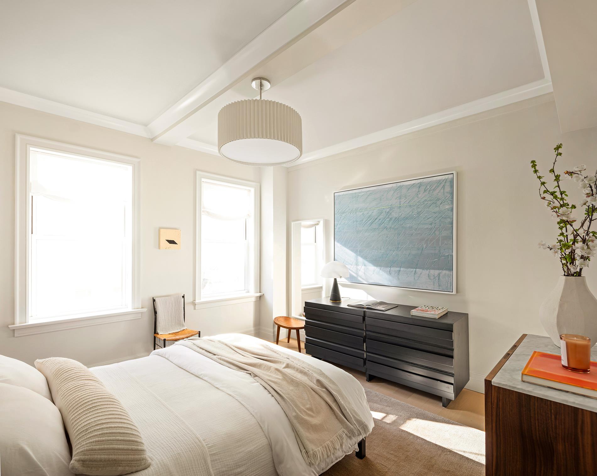 The private quarters are discreetly tucked away from the living space. The bedroom features a south facing windows with townhouse views and a large closet. The beautifully appointed bathroom features Honed Bianco Carrara wall and floor tiles, a custom vanity and LED medicine cabinet, and polished nickel fixtures.