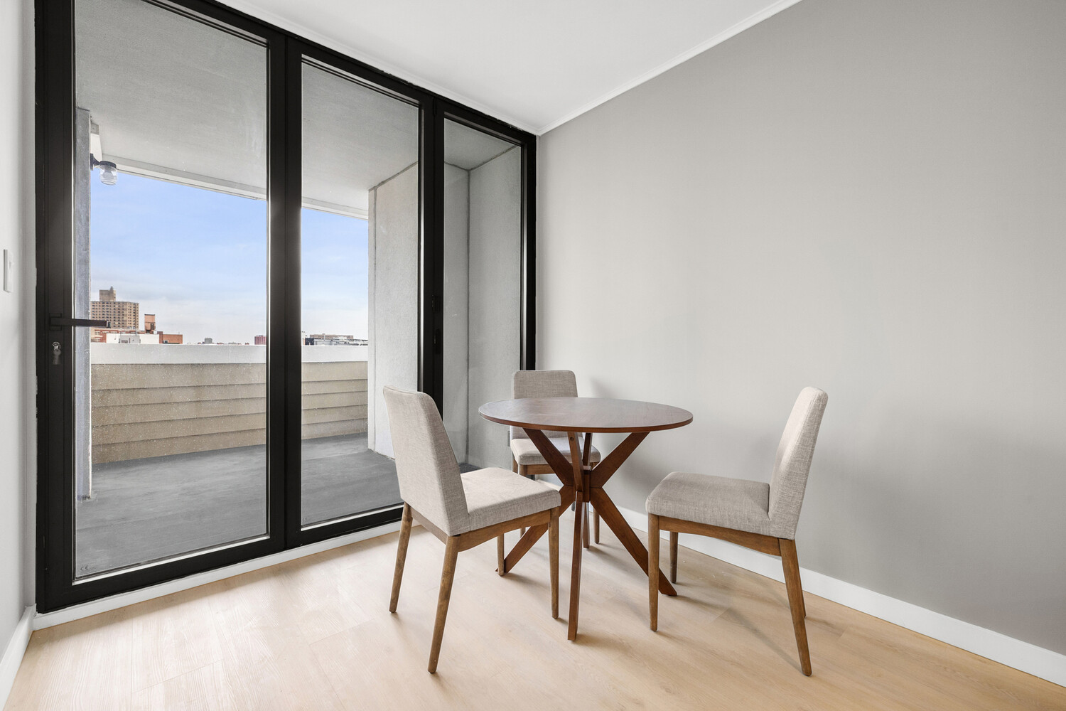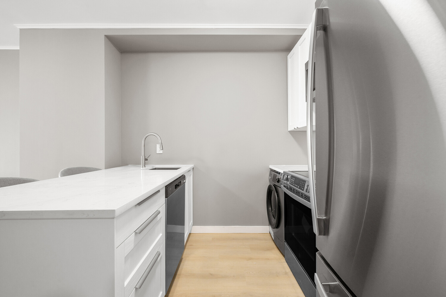 This meticulously crafted one-bedroom home is centered around a 72-square-foot private balcony, accessed through oversized folding glass doors that retract fully to create a seamless extension of the living space. The result is a rare indoor-outdoor experience that enhances everyday living and entertaining. Lofty ceilings, wide-plank white oak flooring, and dramatic floor-to-ceiling windows fill the home with natural light, while the chef's kitchen blends clean design with durable, high-end finishes, including custom cabinetry, honed stone countertops, and a timeless tiled backsplash. Each residence includes in-unit washer/dryer hookups for effortless everyday living and is outfitted with a premium GE appliance package.